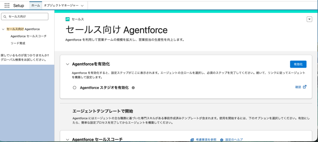 エージェントを作成する前に、Agentforce とセールコーチを有効にする必要があります。Salesforce Go から Salesforce のガイド付き設定に従うか、設定のセールス向け Agentforce ページから有効にすることもできます。