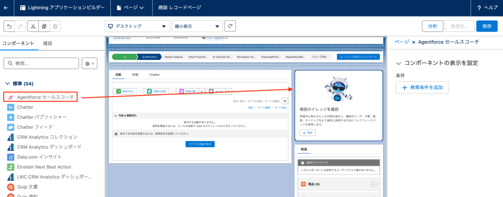 エージェントは作成されましたが、まだ誰も使用できません。次のステップは、エージェントにアクセスできるようにすることです。そのためには、営業者に「Agentforce セールスコーチを使用」権限を割り当て、商談レコードページに追加します。