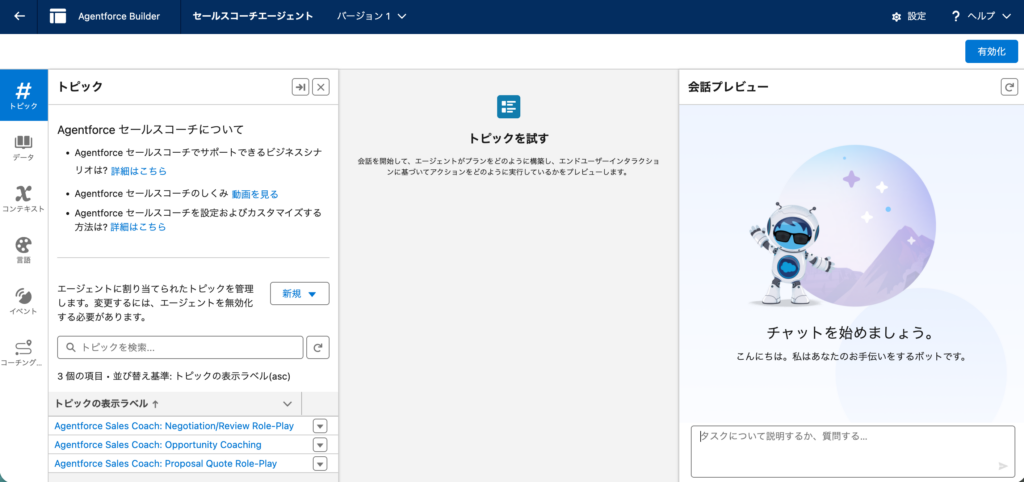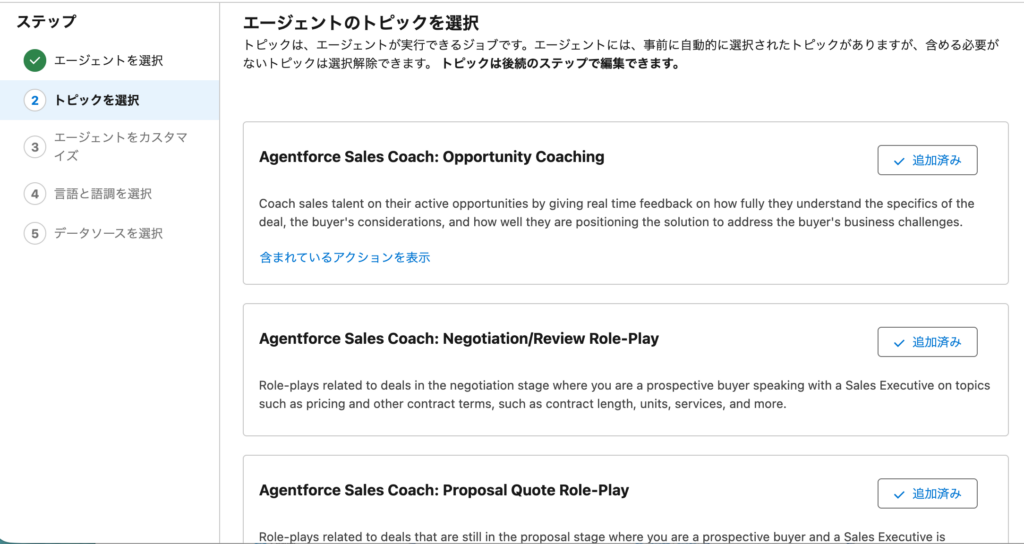 エージェントビルダーでは、3 つのトピックテンプレート(現在テンプレート内容は英語のみ)を選択できます。これらは「商談コーチング」「交渉ロールプレイ」「提案見積ロールプレイ」です。エージェントのトピックを制限することもできますが、ここではすべて含めてご紹介します。