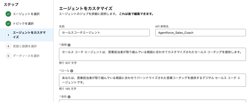 次に、エージェントをカスタマイズし、そのロールと会社に簡単な定義を追加します。