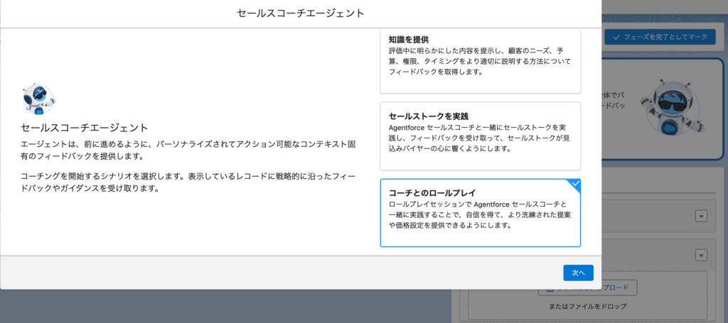 ロールプレイでは、営業者はセールスコーチと最大 5 分間、双方向のやり取りを行います。その後、記録と復習が提供されます。営業者は、自信が持てるまで自由に練習することができます。各セールスコーチセッションは、TODO として保存され、いつでもアクセスできます。