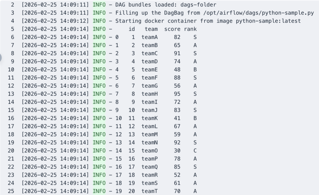 起動したコンテナにマウントする場合絶対パスで指定するところで躓きました。。。ログがAirFlowにそのまま出力されるのでパイプラインコードと処理コードを切り分けて実装できるのが良いなと思いました。他にも便利なOperatorがあるので引き続き勉強していきたいです。