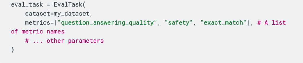 | Pointwise Metrics | 1 つの回答を単独で評価(品質・安全性・事実整合性など) | question_answering_quality, safety, exact_match, rouge_l_sum |