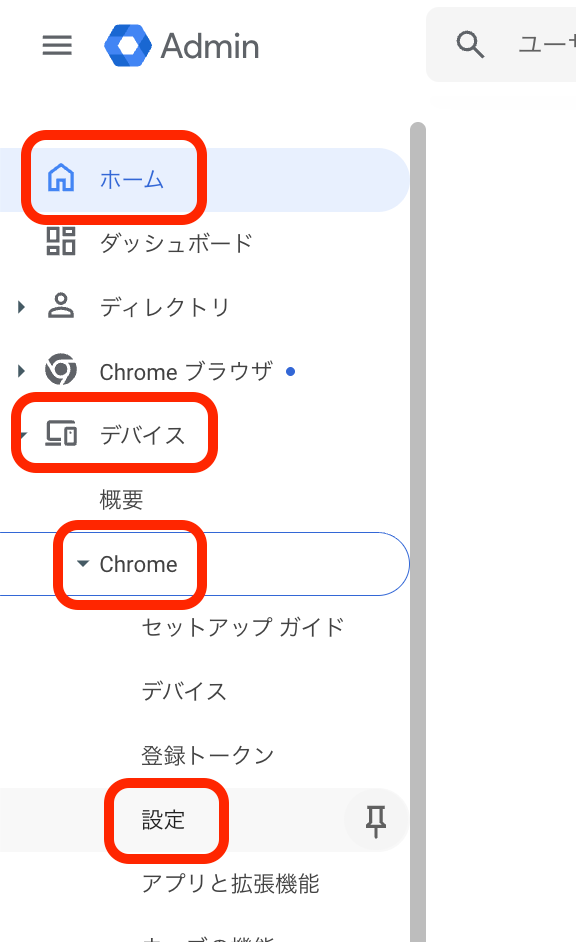 [デバイス] > [Chrome] > [設定] を押下します。