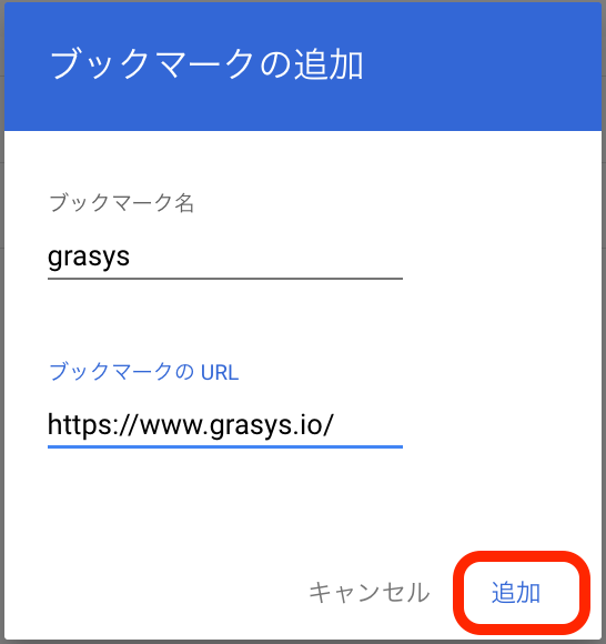 ブックマーク名、ブックマークのURLを入力して、[追加]を押下します。