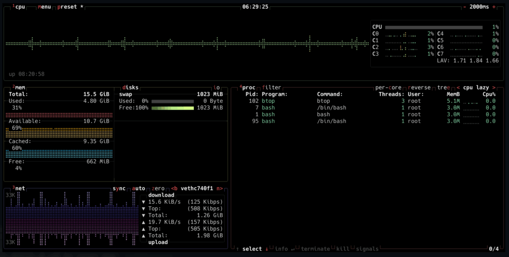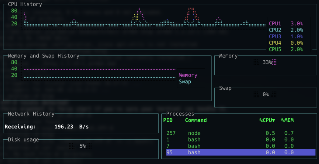 おしゃれな top 系ツールで試してほしい 2 つ目、TUI の直感的に見える画面がとても見やすいです!(node.js が必要なのが難点)