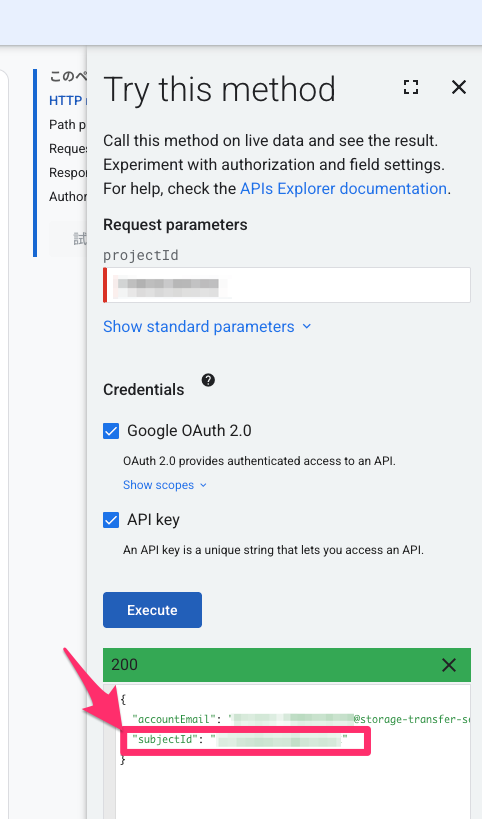 プロジェクトIDを入れてExecuteボタンを押すと、ログインを求められた後、サブジェクトIDを取得できます。
