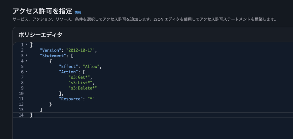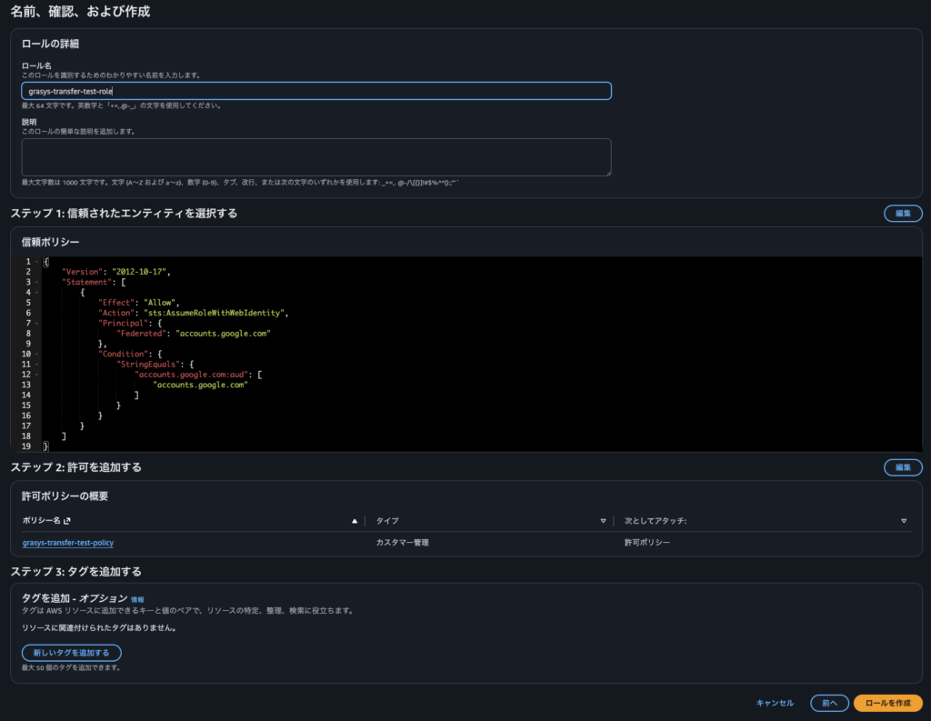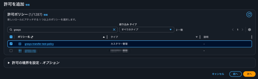 作成したポリシーを許可ポリシーに設定したロールを作成します。