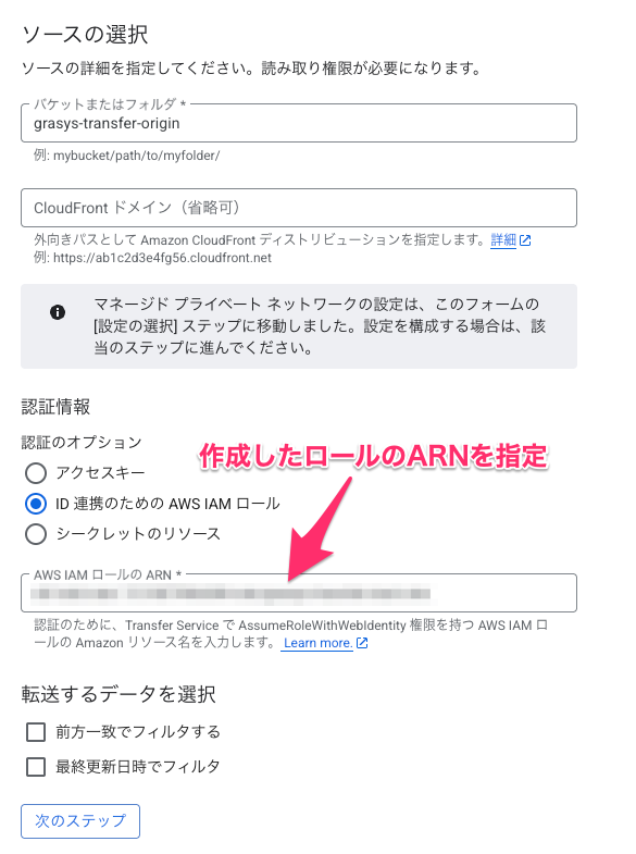 この後ロールの「信頼されたエンティティ」を更新するのですが、Google Cloud側のStorage Transfer Serviceで使用するサービスアカウントのサブジェクトIDが必要なので、先にそれを取得しに行きます。