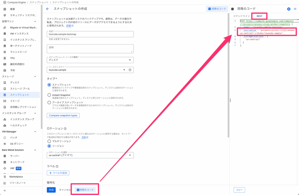 snapshotを作成するときに必要な、sourceDisk: ${“projects/”+project+”/zones/”+zone+”/disks/”+instance_name}については、先ほどと同様コンソールで作成画面を進め、”同等のコード”→”REST”を確認して取得してきています。